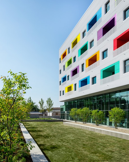 "This 65,000 square foot hybrid library/affordable housing project in Chicago combines a 16,000 square foot branch library with a 40-unit affordable housing development. The two-story library supports reading and learning areas for all age groups, as well as a large community multi-purpose room which supports public lectures, gatherings and events. The second floor of the library looks out over a large roof garden which covers the parking lot below and serves as an outdoor amenity space for the housing residents. Housing units all feature outdoor colored balconies spaces which speak to individual identity."