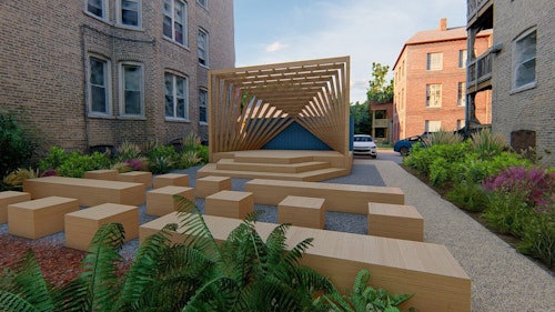 Stone Temple is located in North Lawndale is part of a larger vision to activate Stone Temple Baptist Church’s community garden and outdoor areas with community programs such as musical performances, cookouts, outdoor meetings, poetry sessions, among many others. This first phase of Stone Temple includes a small wooden stage with an open canopy structure, and flexible modules of wooden seating that can be arranged in different configurations.